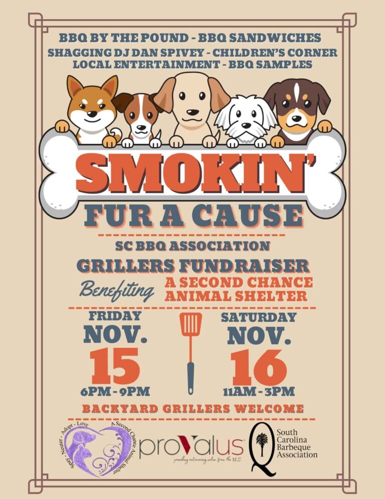 Get ready for a mouthwatering weekend of BBQ, charity, and family fun at Smokin’ Fur A Cause, an exciting two-day event sanctioned by the South Carolina Barbeque Association. This BBQ competition brings grill masters to the heart of Manning, SC, all to benefit a great cause: A Second Chance Animal Shelter.