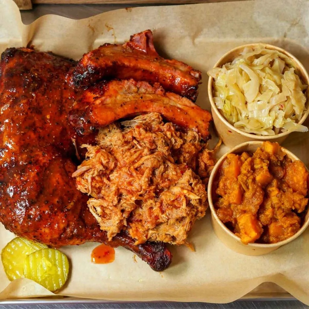 For folks who want variety without overthinking it, combo plates let you mix and match. There’s a “pick two” option built around ribs, wings, leg quarter, and pulled pork, and a house sampler called “The Cowboy” that brings all three meats together.