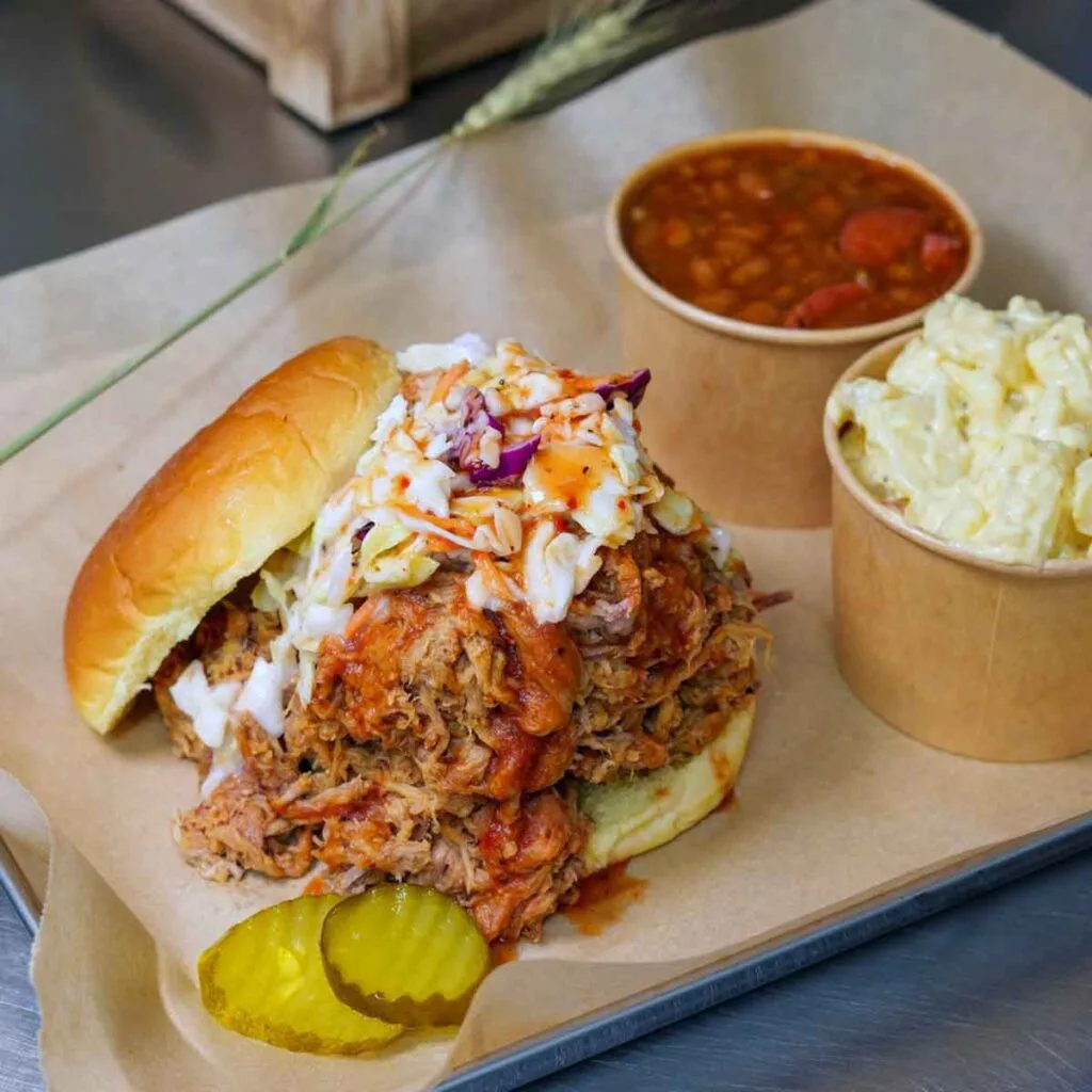 If you like to start with the basics, you’ll find pulled pork, rib, chicken, and pork chop options, offered as sandwiches and as boxed plates. The pulled pork sandwich comes “topped with slaw,” with “No slaw upon request,” which is the kind of small detail regulars notice.