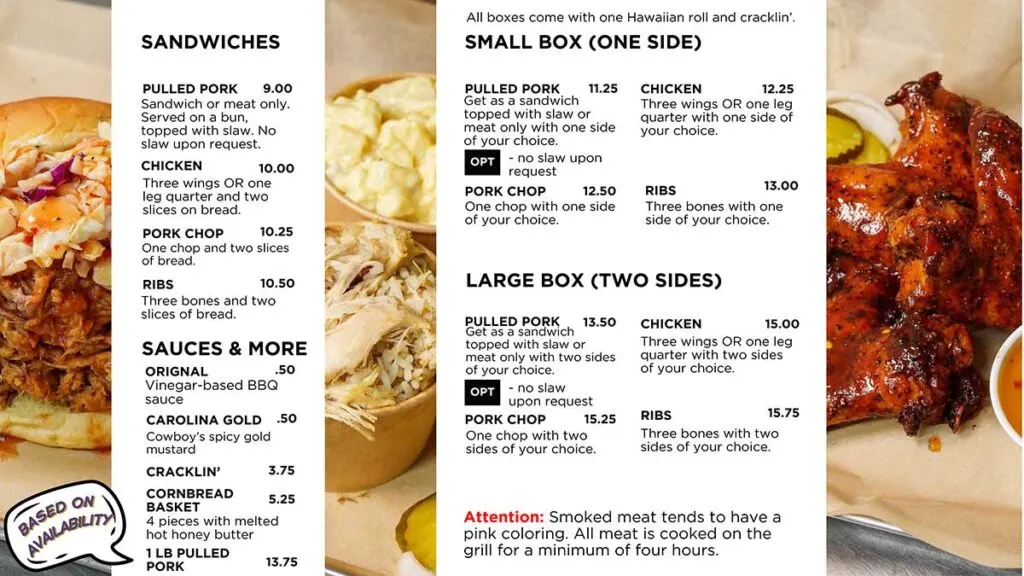 A couple of house touches show up across the menu. “All boxes come with one Hawaiian roll and cracklin’,” and the restaurant offers party pans for groups.