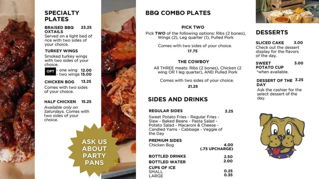 The menu centers on pulled pork, ribs, and chicken, with the pork coming from “butts and hams.” At Cowboy’s, they focus on made-to-order plates, so your barbecue comes out fresh instead of sitting on a buffet line.